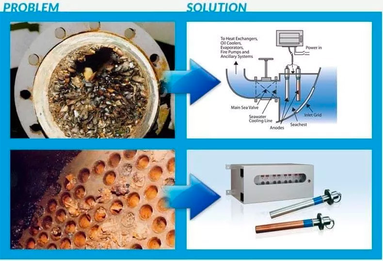 Most systems are dual action, removing biofouling and reducing corrosion. In the case of steel pipes, the corrosion suppression anodes are made of aluminum, while cupro-nickel pipes are protected against corrosion with ferrous anodes. When installed, corrosion rates are significantly reduced, extending the life of pipes and any other equipment that is connected to the seawater system.